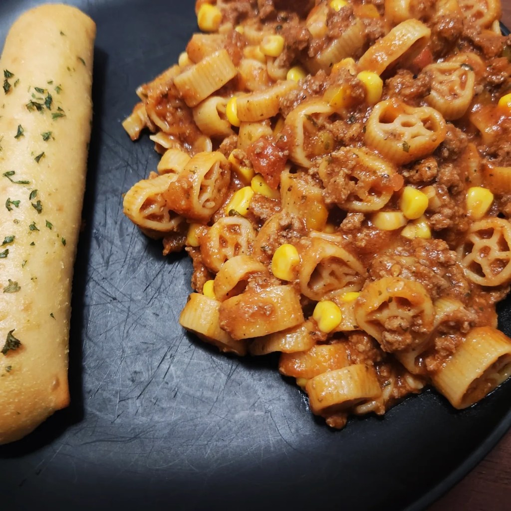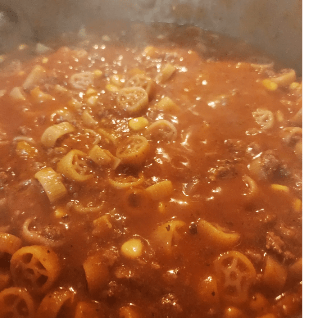 Start by adding a pound of ground beef, diced tomato, onion, and bell pepper to a large pot. Cook until meat is fully browned, then drain the grease. Next add in a teaspoon of worcestershire sauce, a teaspoon each of salt and black pepper, a 30 ounce can of tomato sauce, 3 cups of beef broth, a can of corn, and 16 ounces of pasta noodles. I like to use wagon wheels so the kids are interested in the dish.