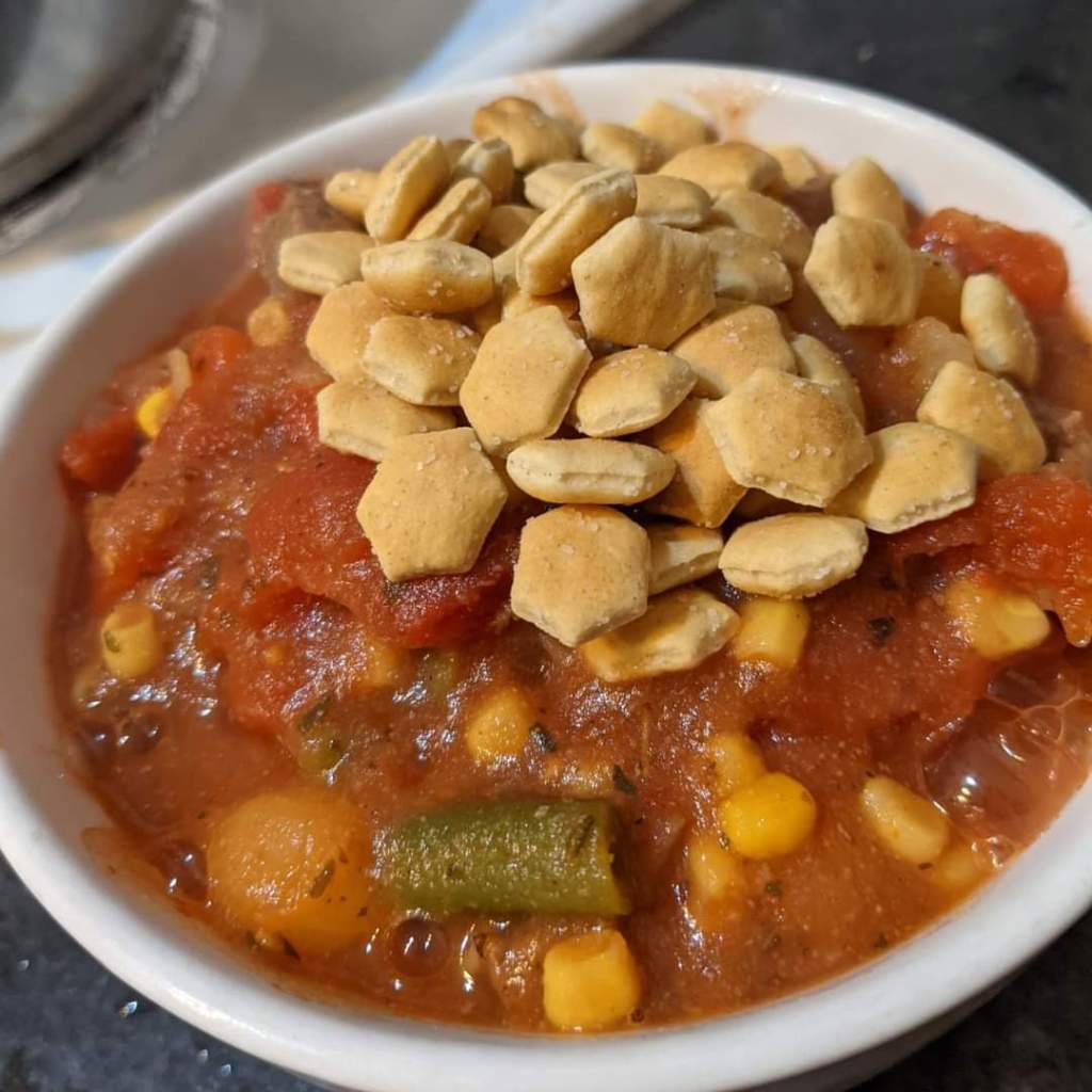 Start by cooking up a pound of ground beef in small to medium chunks in a large pot. Drain the excess fat and return to pot. Combine 2 teaspoons of worcestershire sauce, seasonings (salt, pepper, garlic powder, onion powder), a packet of frozen mixed veggies, a pack of onion bulbs, a can of whole baby potatoes, a 16 ounce can of tomato sauce, and 3 cups of beef broth.